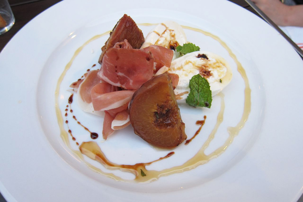 First off, burrata with wood roasted peaches, prosciutto and rosemary honey. I thought peaches and burrata would be an unusual combination but it's so good! So many textures and flavors! The sweet, juicy peaches were delicious with the cool, creamy burrata which was sprinkled with a tiny bit of sea salt.