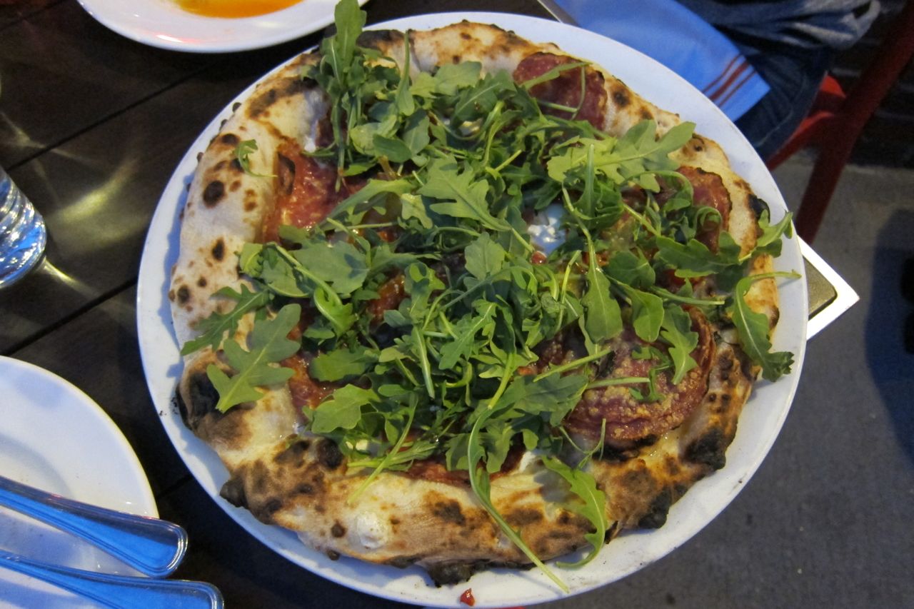 Here we go. The soppressata with spicy pork salumi, mozzarella, Tuscan pepper, oregano, arugula, and parmesan.